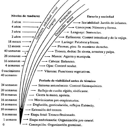 A continuación observa el diagrama donde se representan las tendencias generales del desarrollo de la conducta debido a su madurez, desde la concepción hasta los cinco años.